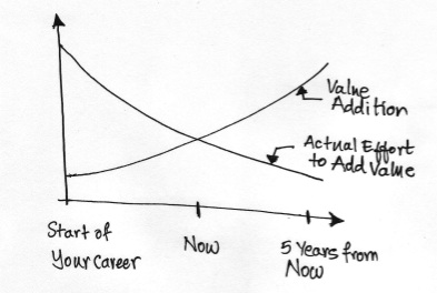 આદર્શ પરિસ્થિતિમાં તો જેમ કારકિર્દી આગળ ધપતી જાય તેમ મૂલ્યવર્ધક પરિણામો સિદ્ધ કરવા માટે જરૂરી પ્રયત્ન ઘટતો જવો જોઇએ, કે એટલા જ પ્રયત્નોને પરિણામે વધારે મૂલ્યવાન પરિણામો મળવાં જોઇએ.